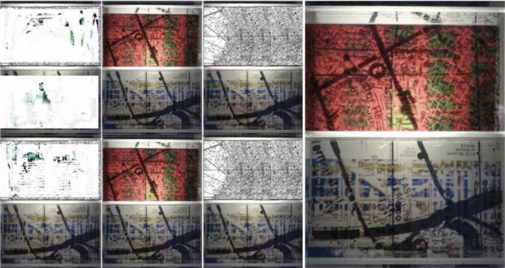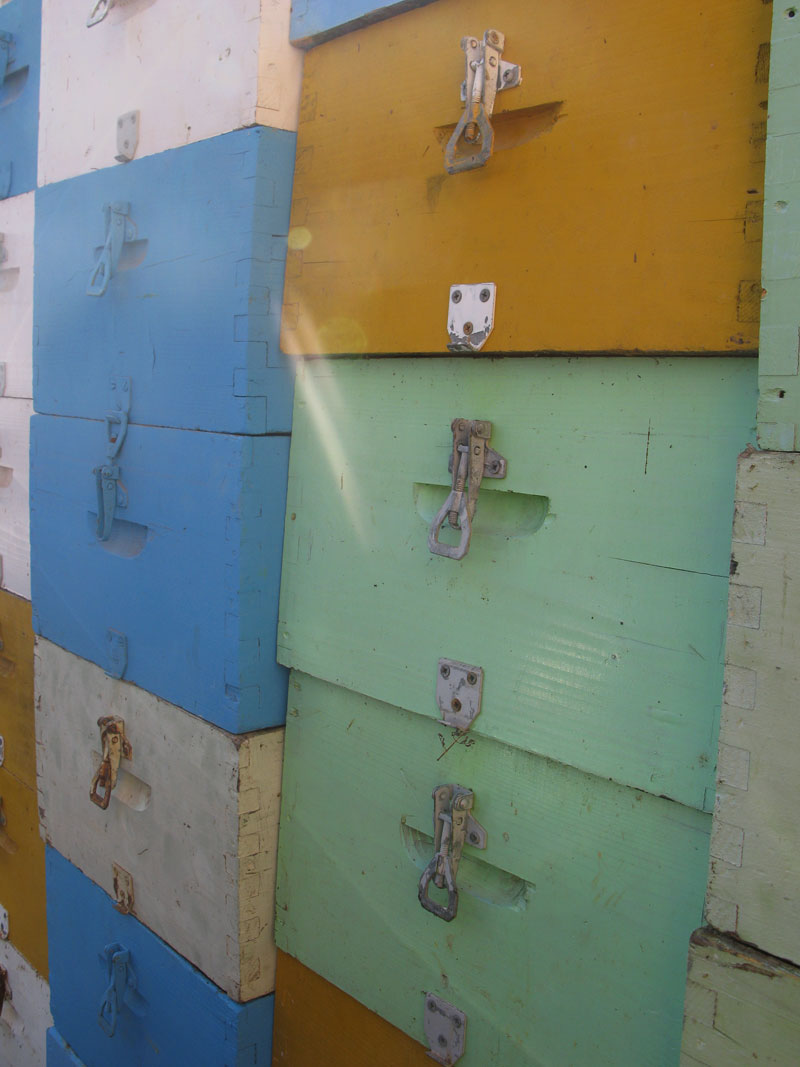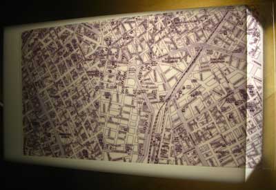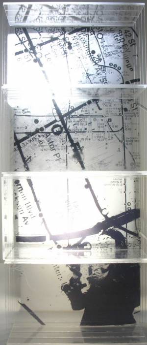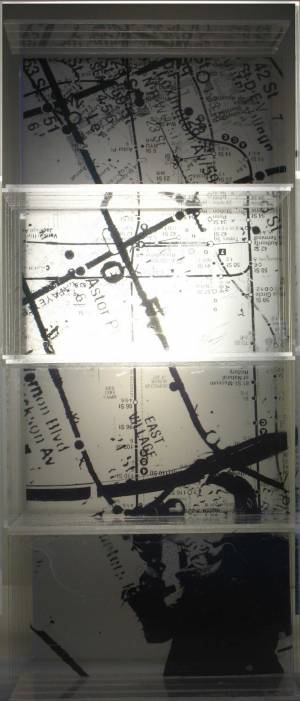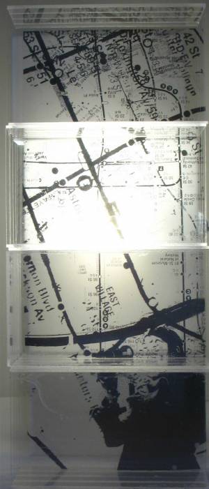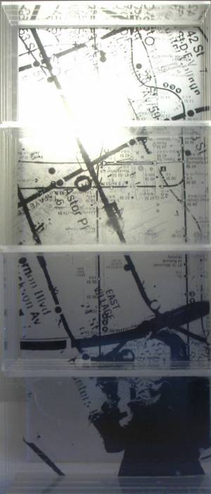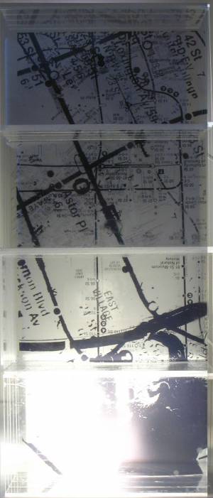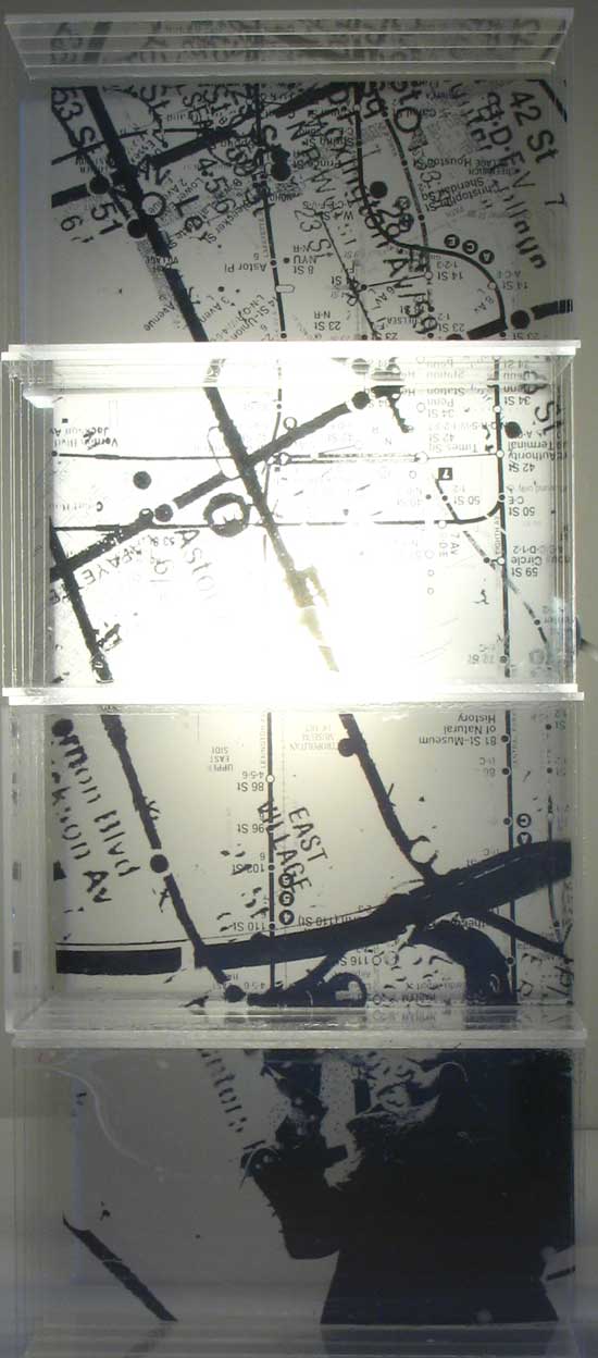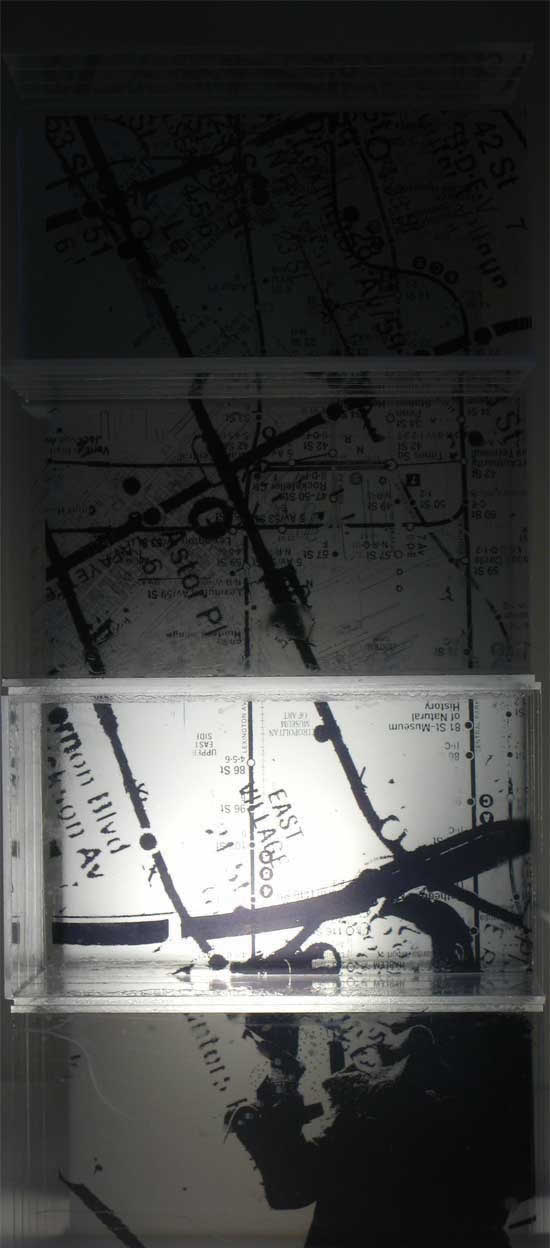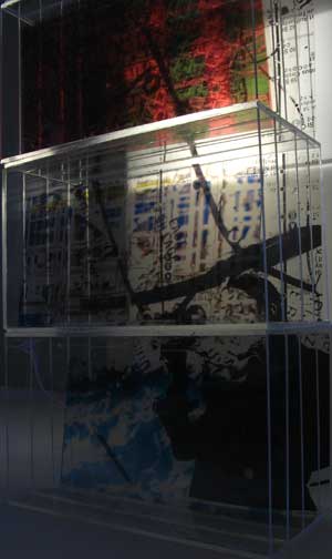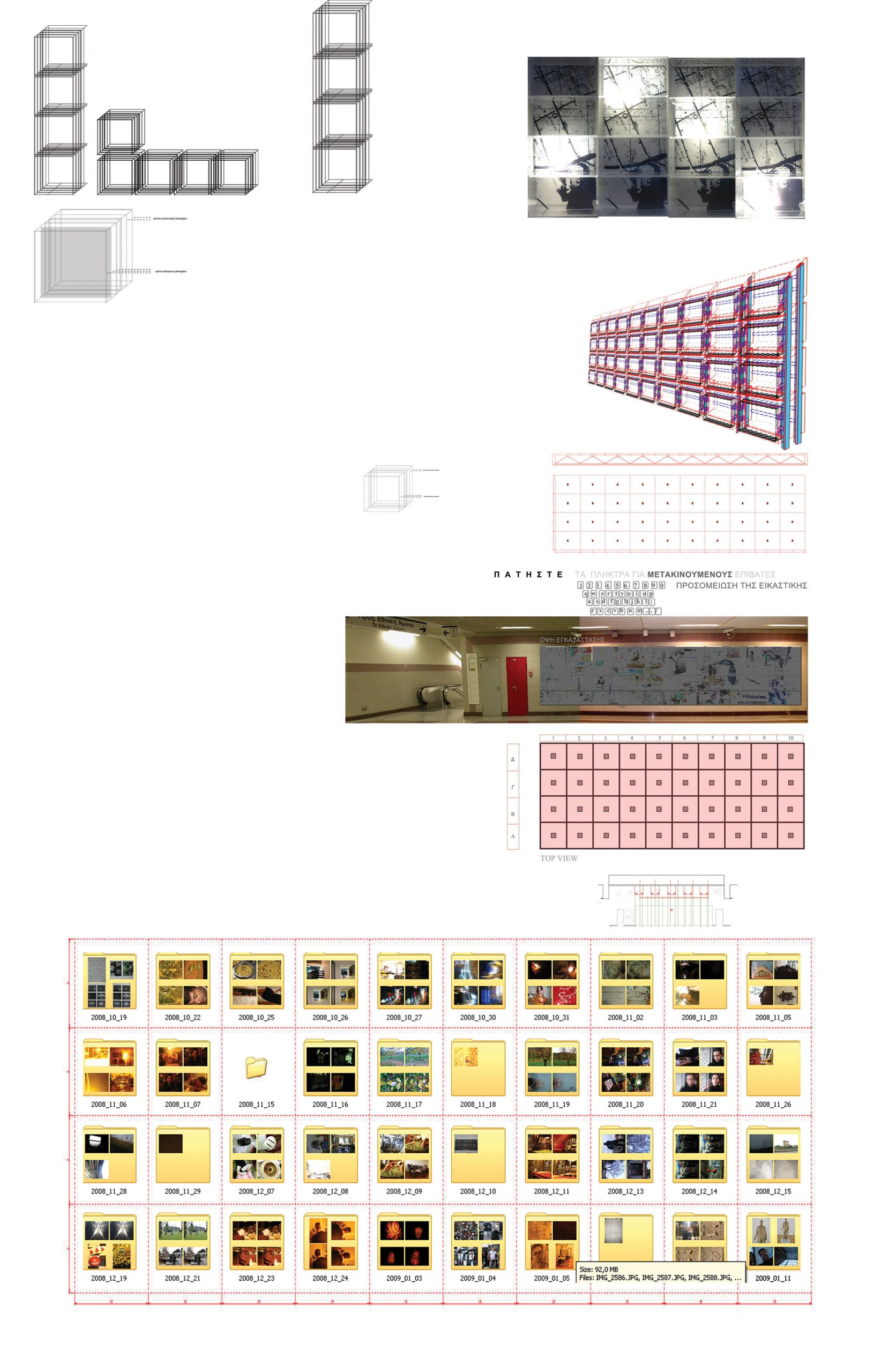 Από τη μία μεριά την ύπαρξη 40 μεταλλικών κουτιών (μακέτα των οποίων σε κλίμακα 1:10 παρείχα στον οργανισμό σας κατά την διάρκεια του διαγωνισμού και τα οποία εμπεριέχουν σε διάφορες επιστρώσεις απο επιλεγμένες φωτογραφίες τυπωμένες σε διαφάνειες αλλά και μια σειρά επιλεγμένων χαρτών από την Ελλάδα και το εξωτερικό.